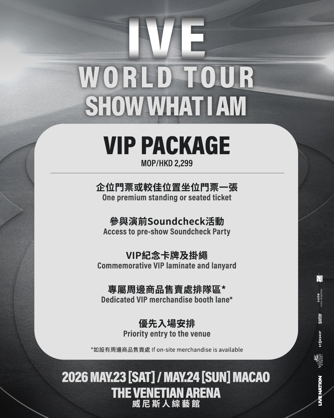 韓國人氣團體 IVE (ANYUJIN, GAEUL, REI, JANGWONYOUNG, LIZ, and LEESEO), 正式公布備受期待的第二次世界巡迴演出《SHOW WHAT I AM》,將於2026年5月23日及24日(星期六至星期日)在威尼斯人綜藝館盛大開唱。